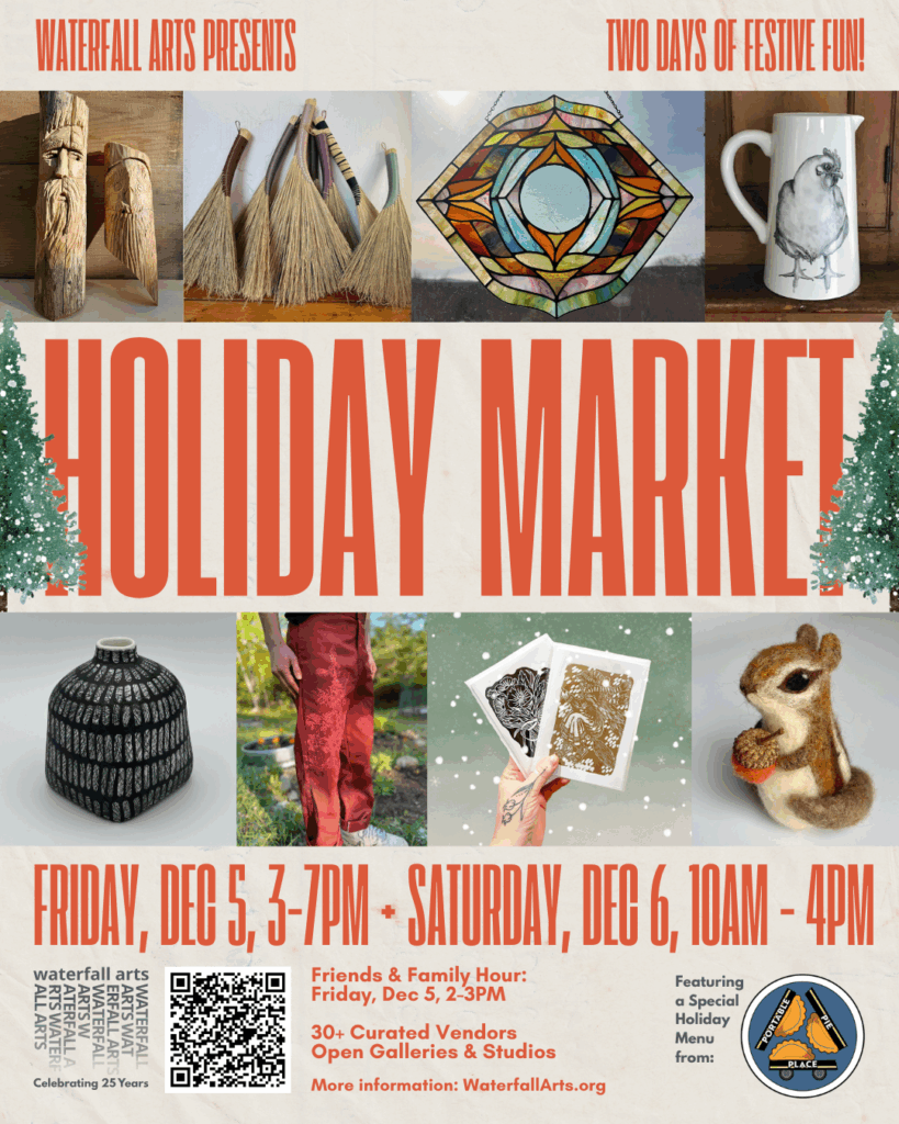 For two festive days, Waterfall Arts will come alive with the sights, sounds, and warmth of the season as our building transforms into a lively indoor marketplace. Stroll through spaces filled with the work of talented Maine artists and makers, and discover one-of-a-kind treasures—from ceramics, jewelry, and textiles to prints, paintings, cards, décor, and more—each piece made with heart and imagination.