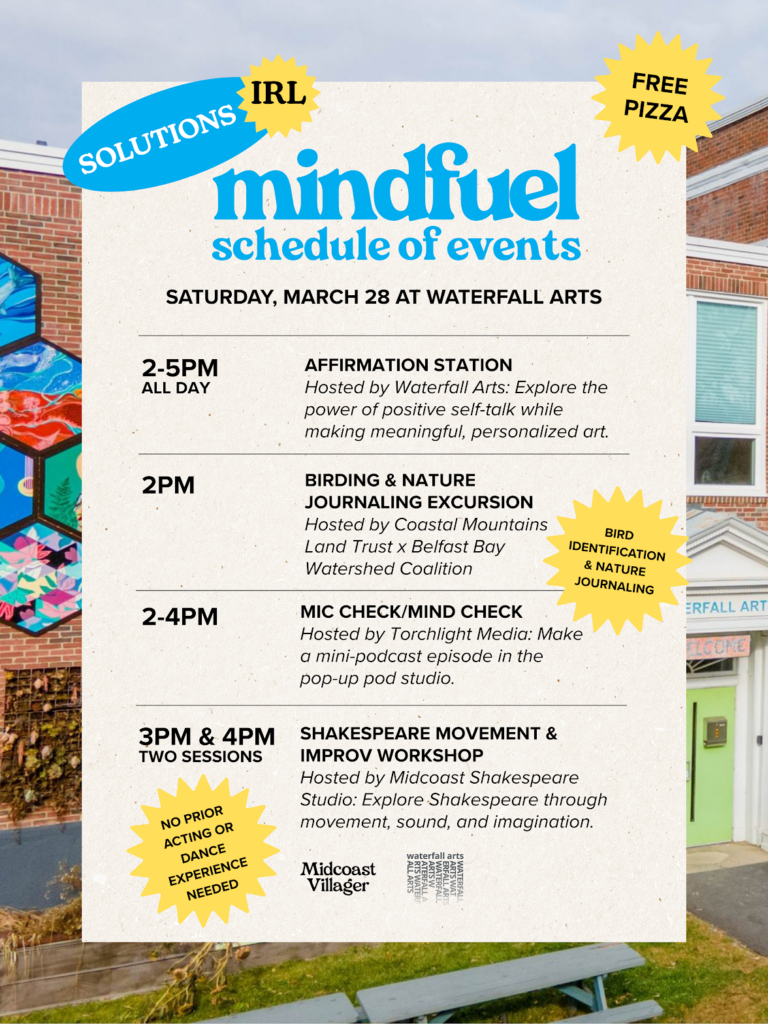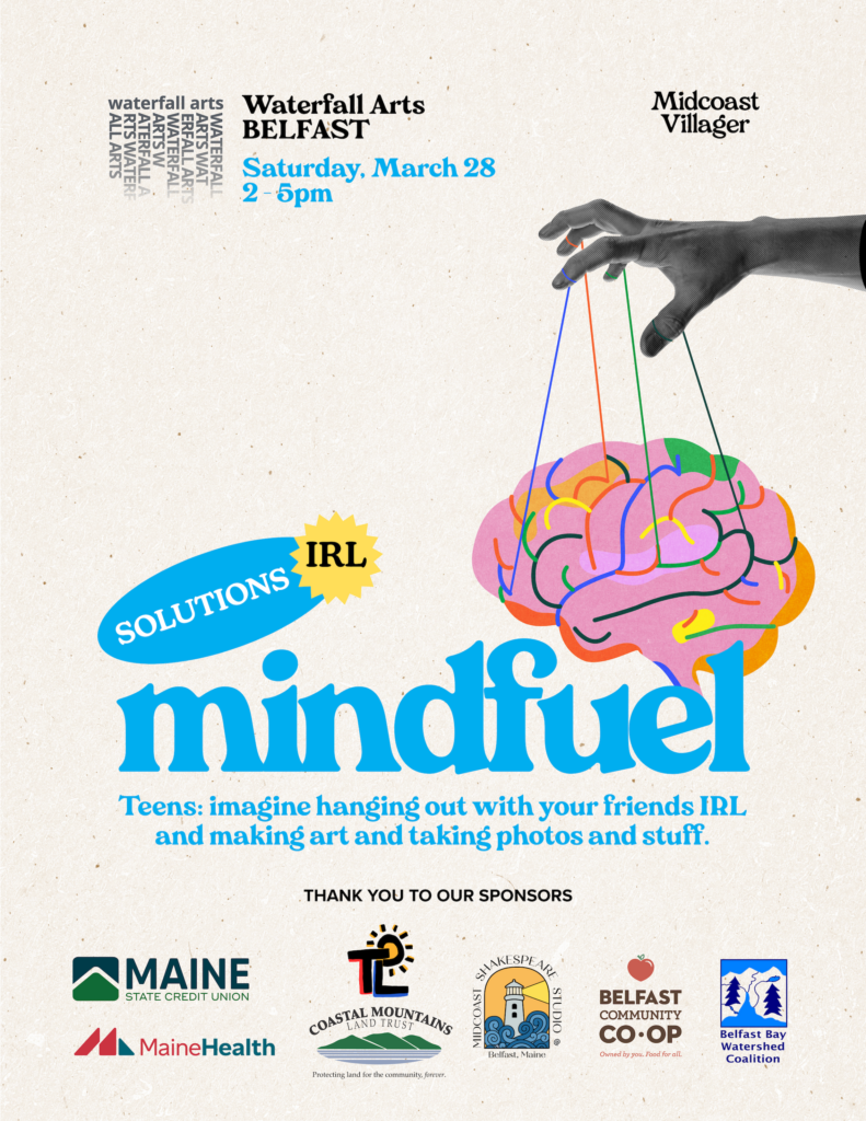 We’re excited to partner with the Midcoast Villager to host a special afternoon of mindful artmaking for teens at Waterfall Arts as part of Solutions IRL: Mindfuel. We’ll be welcoming several local organizations—including Coastal Mountains Land Trust x Belfast Bay Watershed Coalition, Torchlight Media, and MidCoast Shakespeare Studio—to share creative activities and hands-on experiences with young people from across the Midcoast.